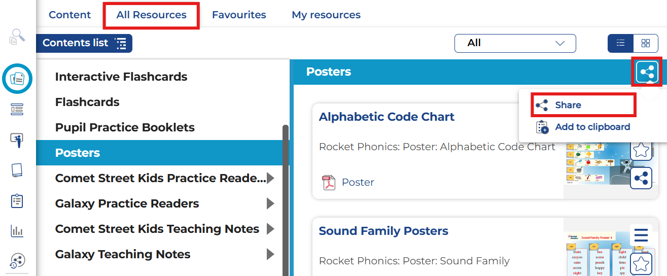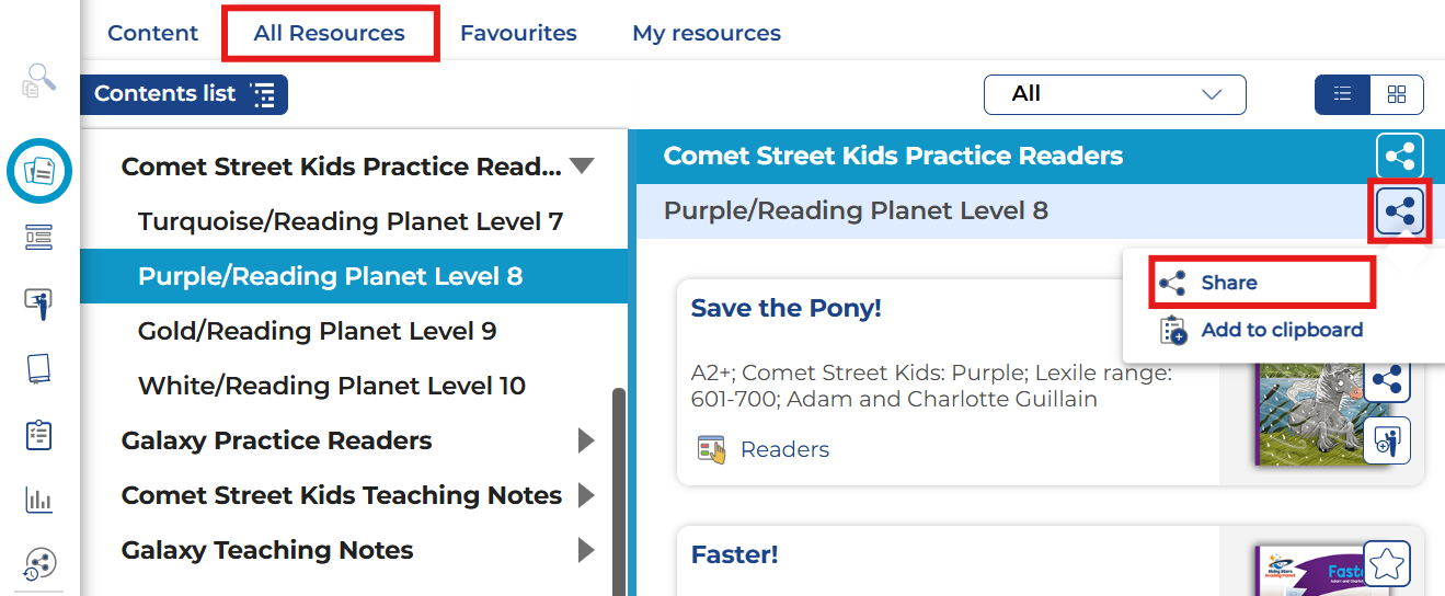 In contrast, learners don't have access to the content unless you share it with them. You can share whole topics, specific units/book bands, or individual eBooks and resources.