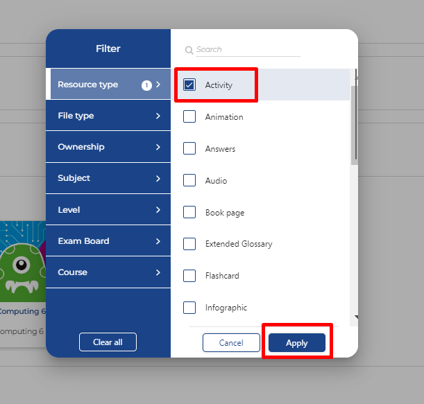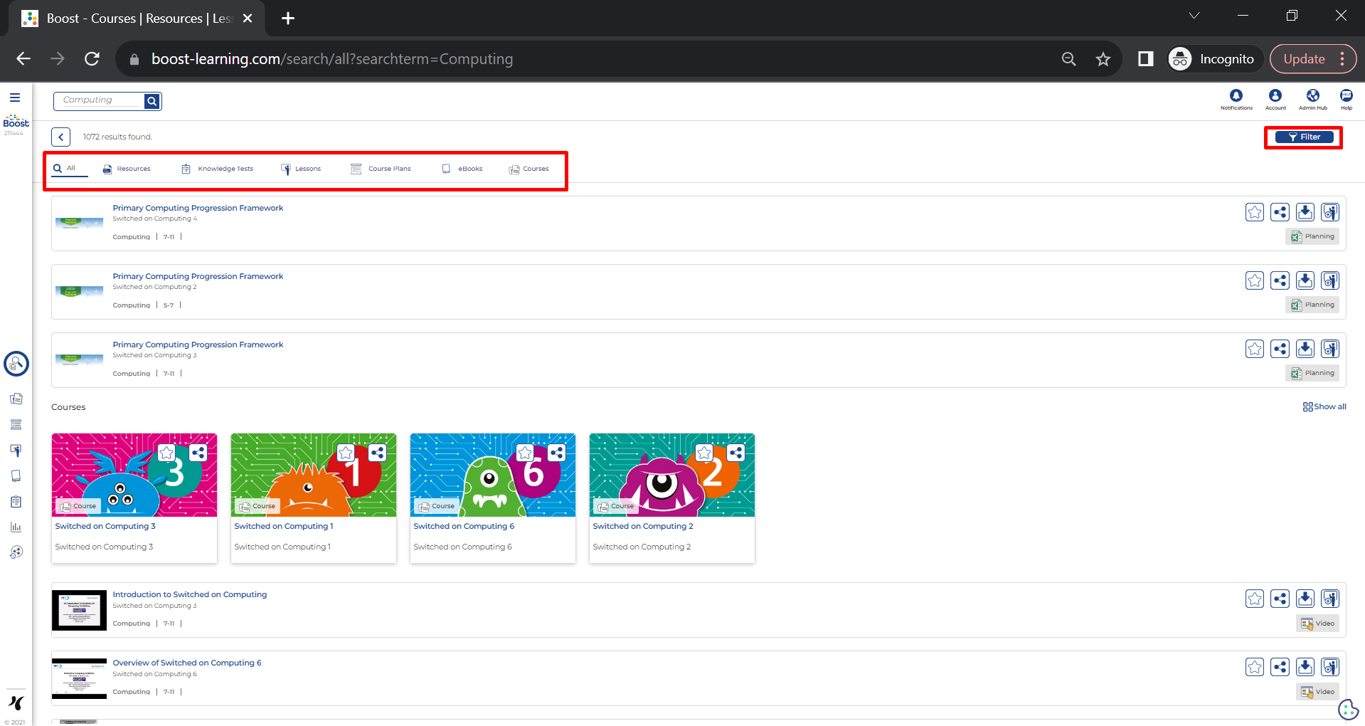 Once your results have loaded, the tabs at the top let you filter the results by category: resources, Knowledge Tests, lessons, Course Plans, eBooks and courses.