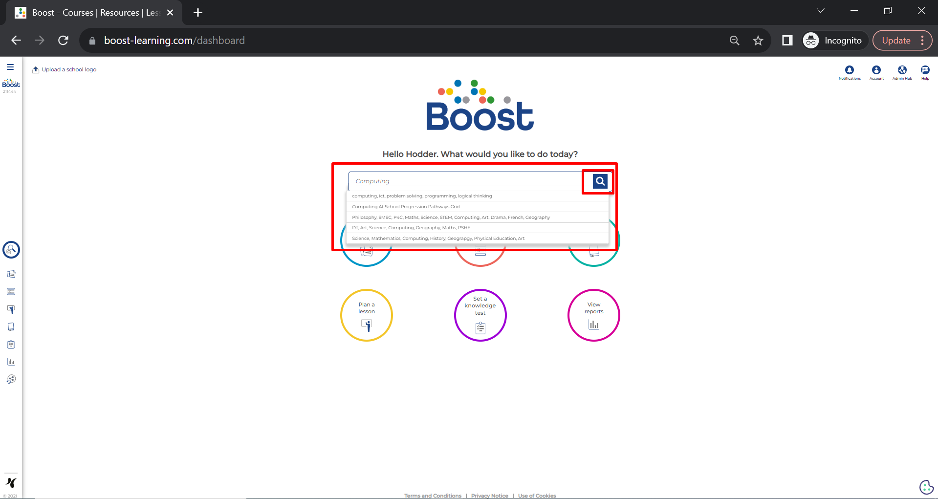 You can search for resources or courses from any page in Boost via the search bar. This appears in the centre of the dashboard, and at the top left of all other pages in Boost. To use the search, enter your search term(s). Press 'Enter' on your keyboard, or select the magnifying glass.