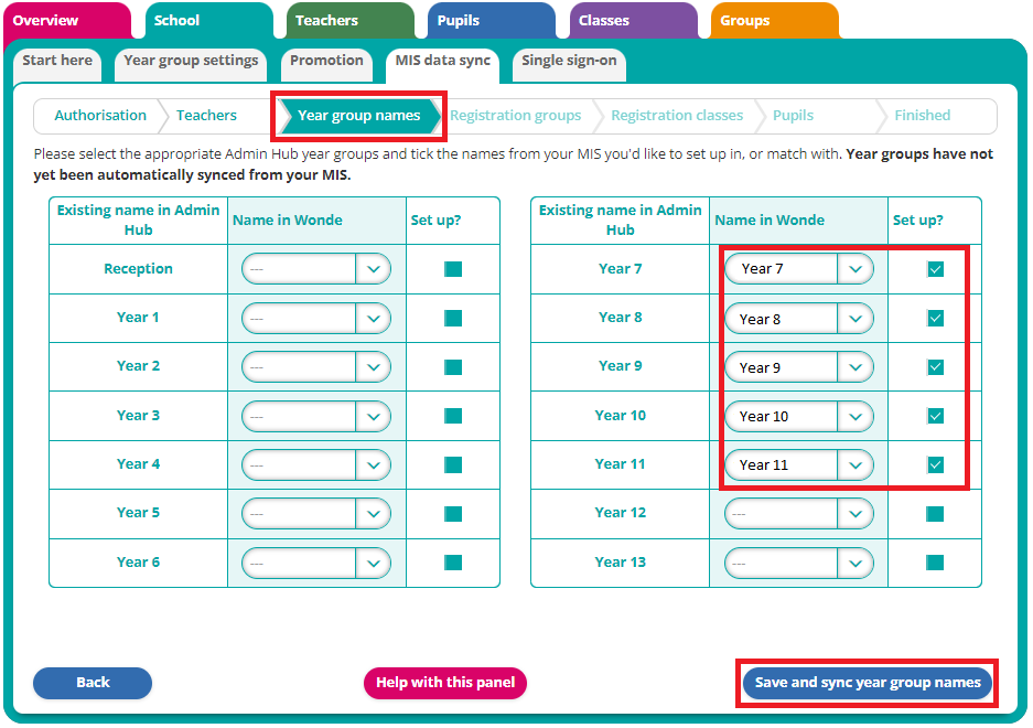 The system will automatically detect the year group names in your MIS. Tick the 'Set up?' column next to each year group you'd like to sync, then Save and sync year group names in the bottom right.