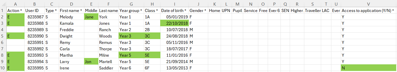 - Column V - Access to application: Type ‘Y’ (for 'yes') or 'N' (for 'no'). Learners without access will not appear on marksheets, reports, or test assignments.