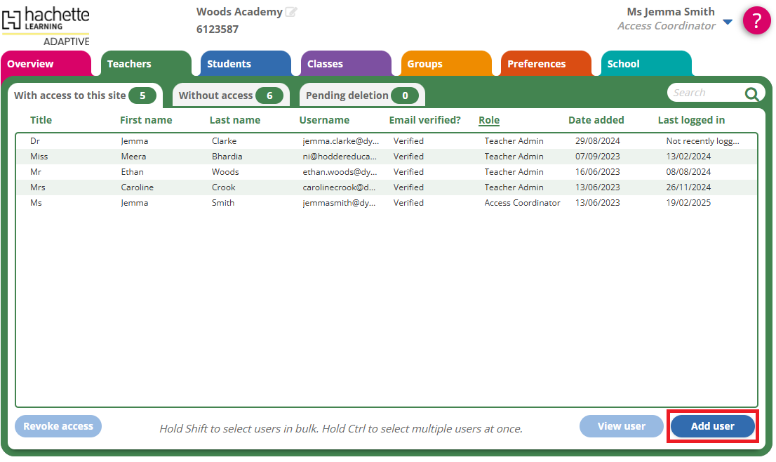 Please note that Admin Hub changes can take up to 5 minutes to take effect in Hachette Learning Adaptive.