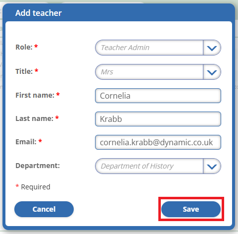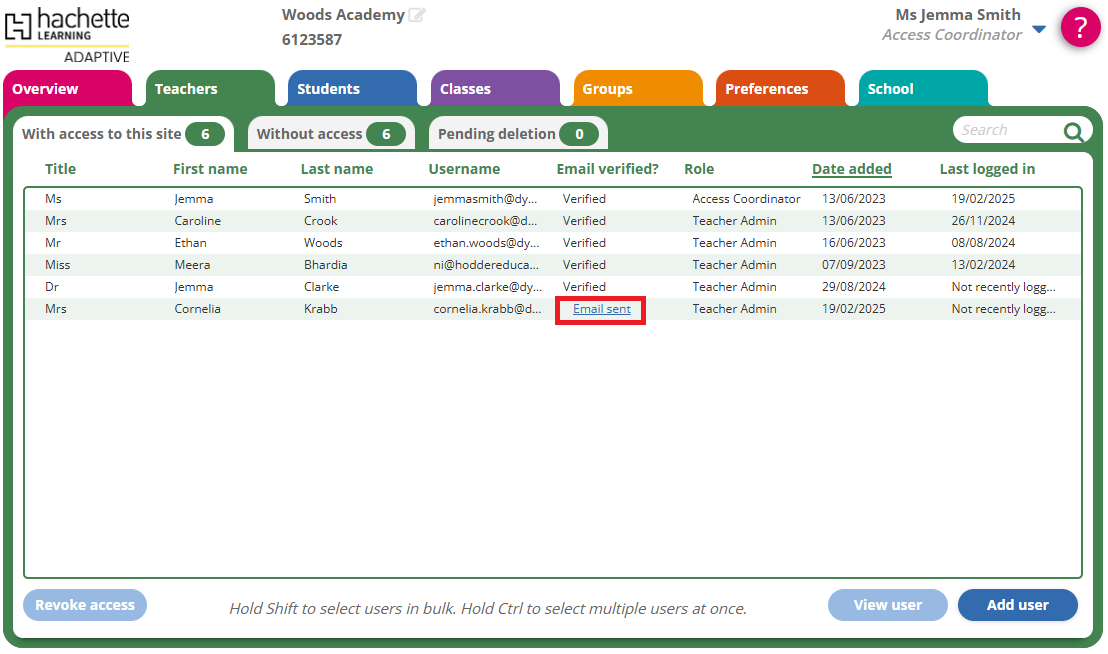 Once saved, the teacher will receive an email asking them to verify their email address and create a password. You can resend the verification email by clicking Email sent under the 'Email verified?' column.