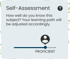 The 'Self-assessment' panel in the bottom left lets you rate your understanding of the topic using a slider with the following levels: