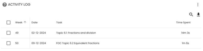 Click on a learner's name to bring up reports specific to that learner, including their Activity log. This report shows the week in which the last logged in and the amount of time they spent working on assigned tasks each week.