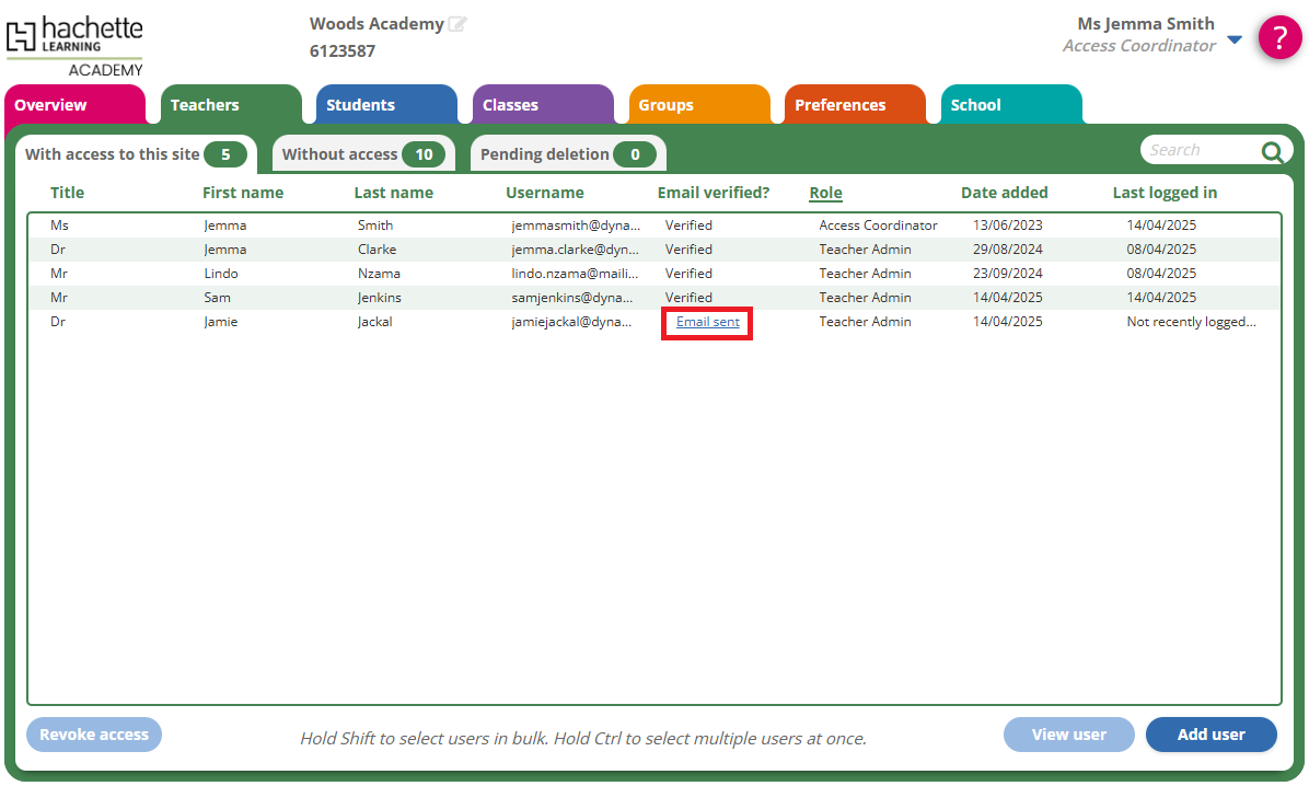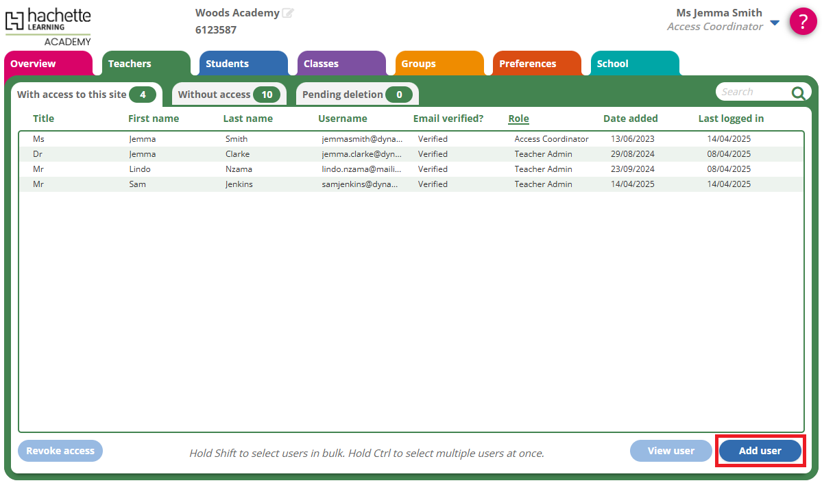NOTE: Because all of our platforms are connected to the same user management system, you may find that some members of staff who aren't CPD admins are listed in the 'Teachers' tab. You should revoke their access, then create CPD learner accounts for them if needed.