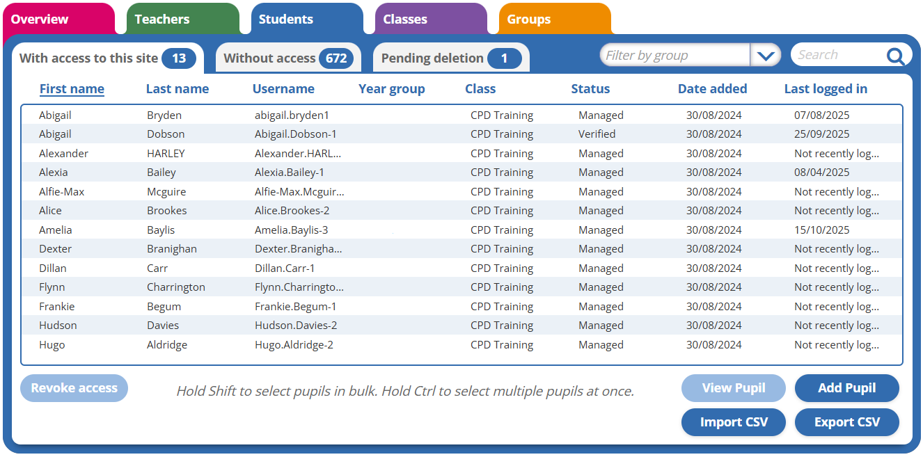- Pending deletion: users in this tab will not appear in the platform and cannot log in. They will be permanently deleted from your Hachette Learning account after six months. See Deleting CPD learners for further guidance.