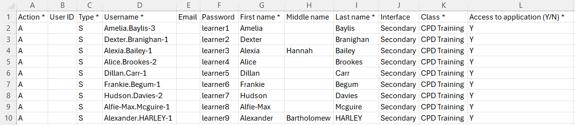 The instructions below show you how to complete a CSV template to add new CPD learners to Hachette Learning Academy or edit existing ones.. See Adding and Editing CPD learners in bulk for help finding and uploading the correct templates.