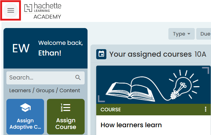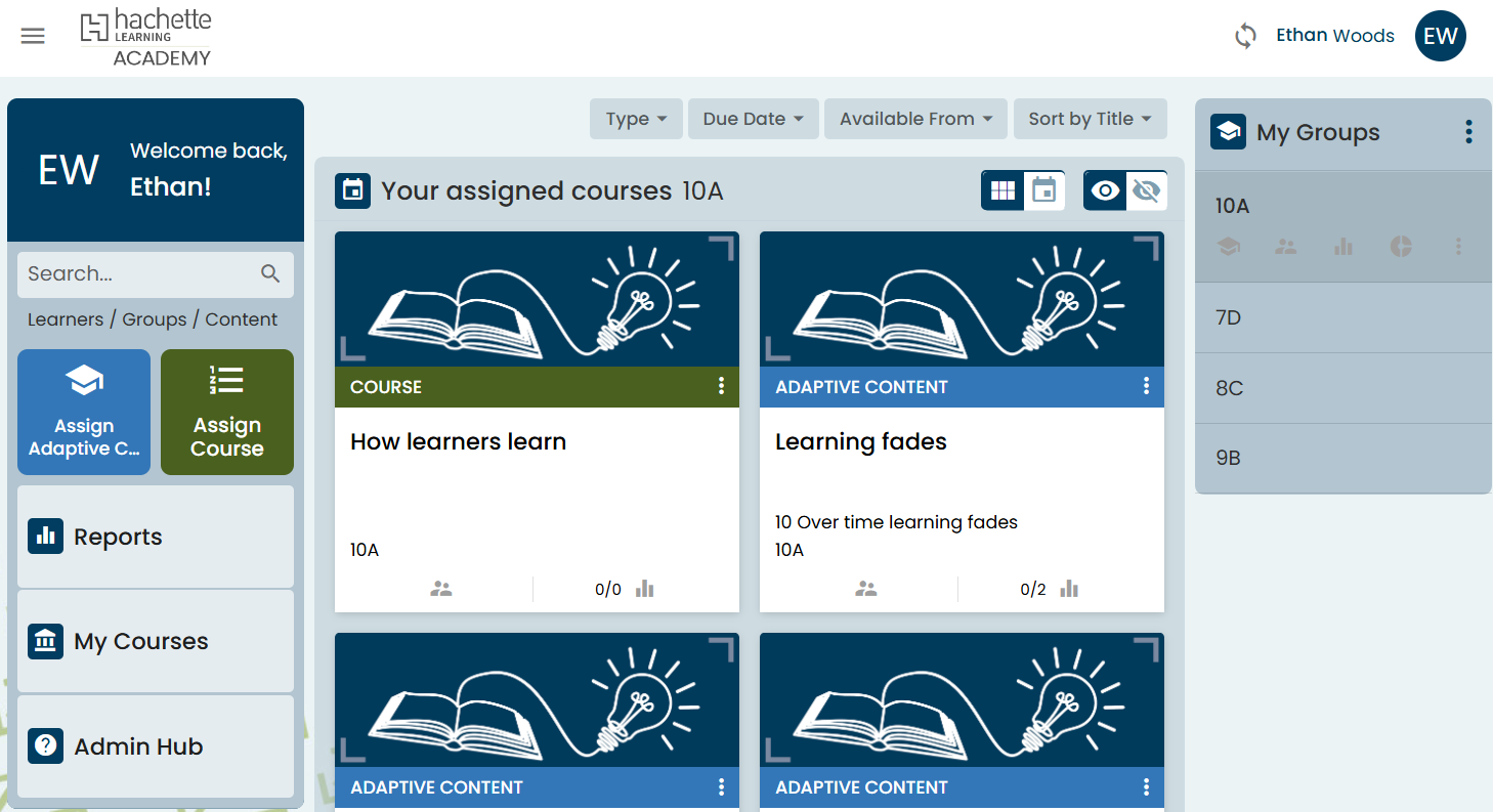 Hachette Learning Academy's CPD admin dashboard is has three main sections: