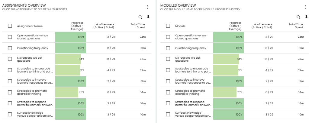 The Assignment/module Overview shows aggregated progress for each assignment in the class, as does the Exam Overview report for any exams. You can click on the name of a assignment to jump to the Learner Dashboard for that specific package, and on the Exam Details button for more granular information on learner-by-learner scores and metacognition.