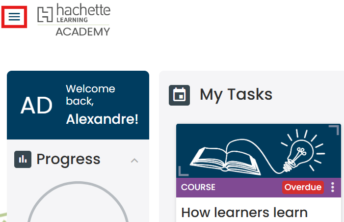 Hachette Learning Academy's learner dashboard has three main sections:
