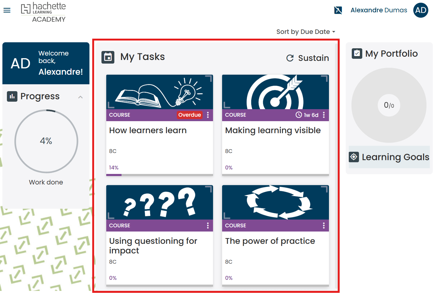 Courses assigned by your CPD administrator appears as task cards in the 'My Tasks' panel of the educator dashboard. Each card contains the course title, due date/overdue status (if a due date was set), and progress percentage.