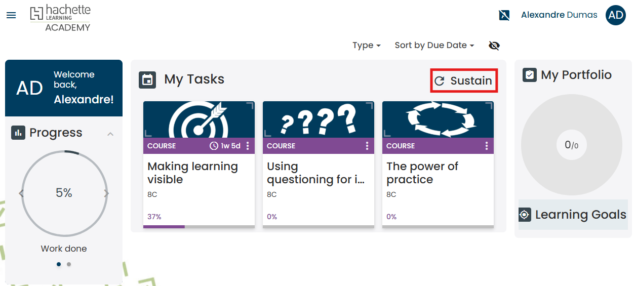 Once you've completed a course, you can revisit its adaptive revision modules as much as you like by clicking Sustain in the top right corner of the 'My Tasks' panel on the educator dashboard. This to help you maintain your proficiency with the key concepts covered by the course.