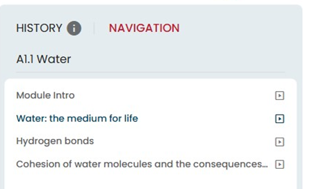 The navigation tab shows all the content in the module. Learners can click on any of these learning objectives to go straight to that content in the module.