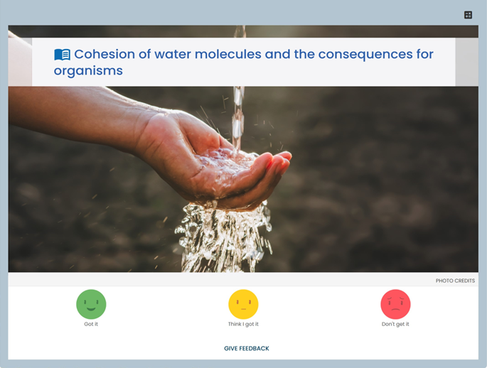 On the next slide, learners then click eBook icon that opens the relevant pages of the eBook on a separate window. Once they have read some content, they will be asked again to rate how confident they are in their knowledge and understanding of this content by clicking on the smiley faces at the bottom of the screen, to indicate if they have ‘Got it’, ‘Think you have got it’ or ‘Don’t get it. Their answer will determine how challenging the questions are that follow.