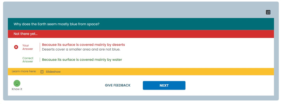 If they are not confident or get the answer wrong, they will see the correct answer and an explanation of why their answer was wrong, and by clicking ‘Learn more here’ they are directed to the pages of the eBook with the content that they need to study more in order to get that question right next time.
