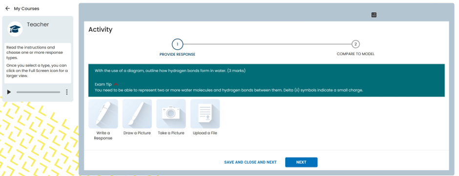 Once learners have finished writing or uploading their answer, they need to click NEXT to see a model answer. If they want to move onto the next question without comparing their answer to the model or self-assessing their answer, they can click on SAVE AND CLOSE AND NEXT.