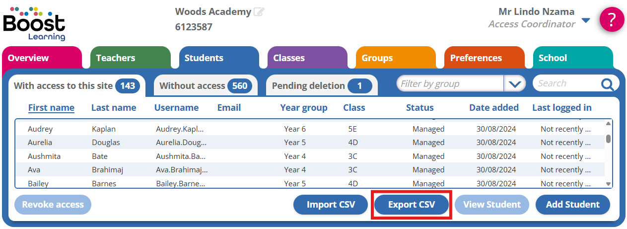 You can export a CSV spreadsheet of your Boost Learning learners from the Admin Hub. This includes the following information: