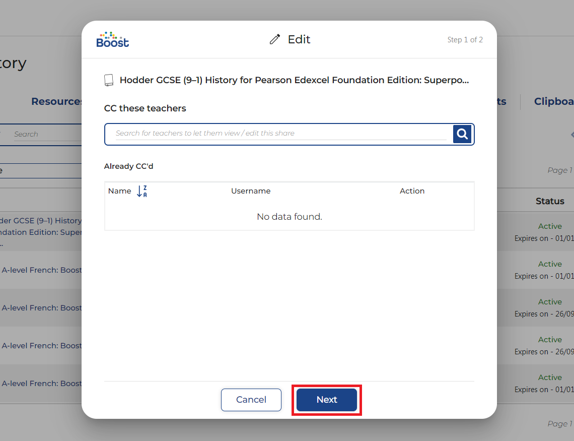 - Copy any additional teachers you would like to notify of the edited share and click Next.