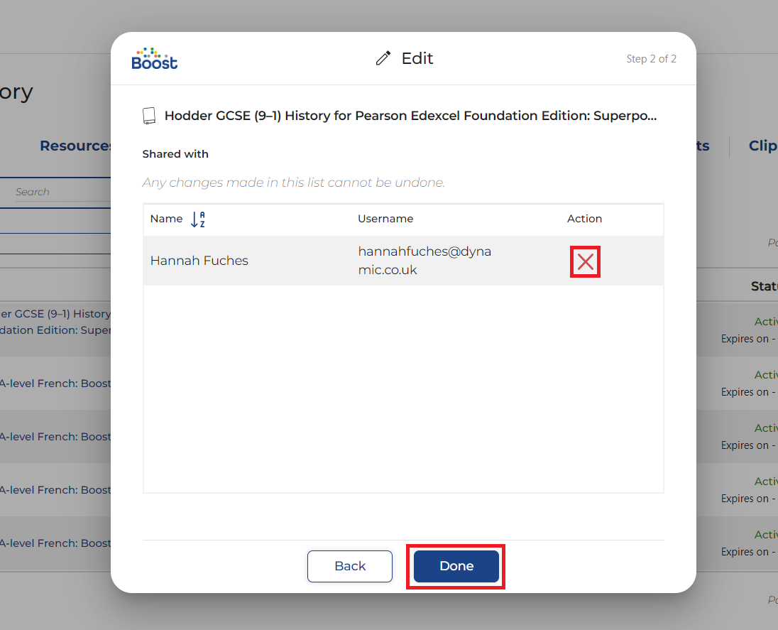 - Click the red X next to the name of the student you would like to remove from the share, then click Done.