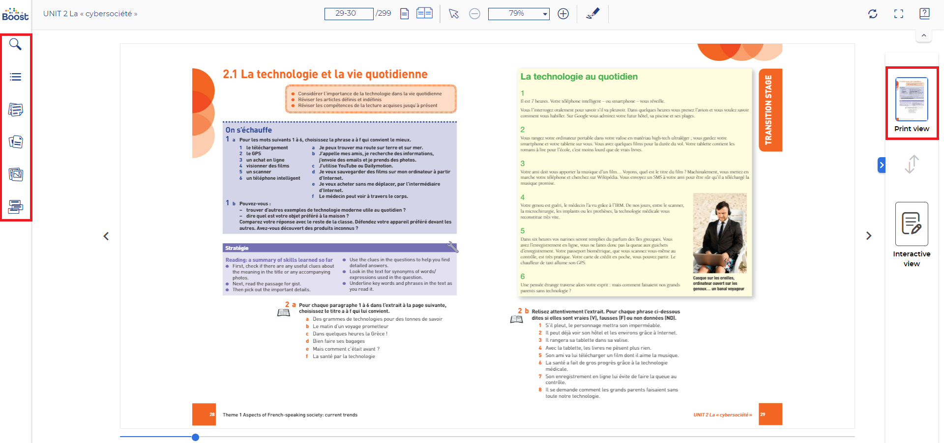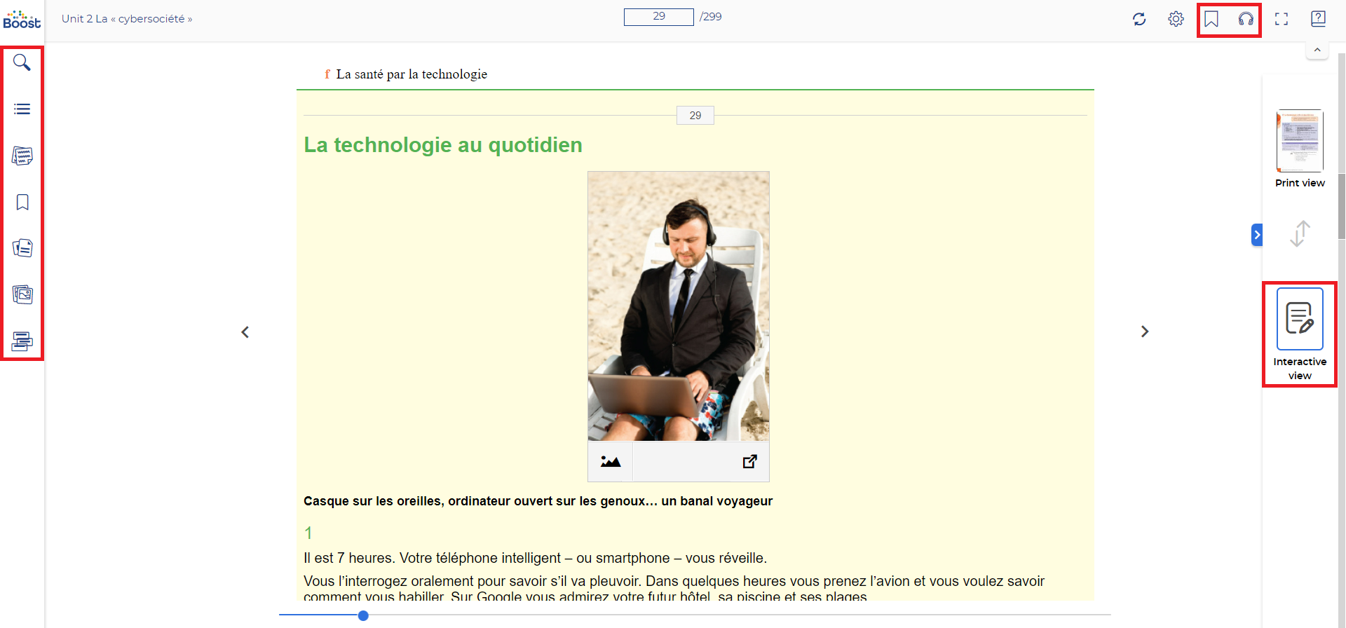 There are two 'views' in the Boost eBooks reader: print view and interactive view. You can switch between these views at any time by clicking their icons on the pull-out tab on the right side of the screen.