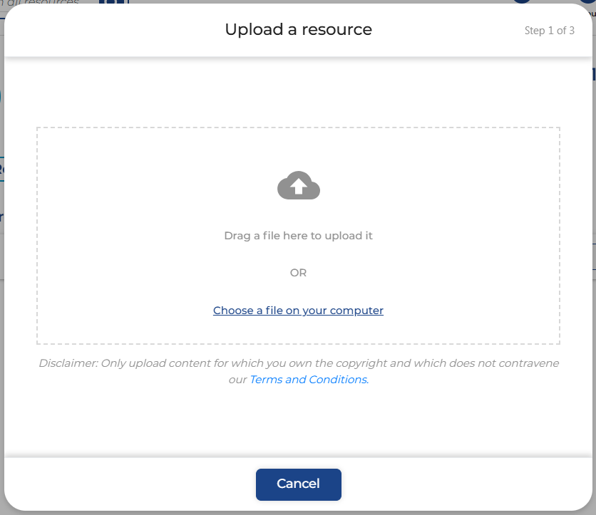 2. Select 'Upload Resource' to open the below box. Either drag and drop files in or select 'Choose a file from your computer' to find your resource: