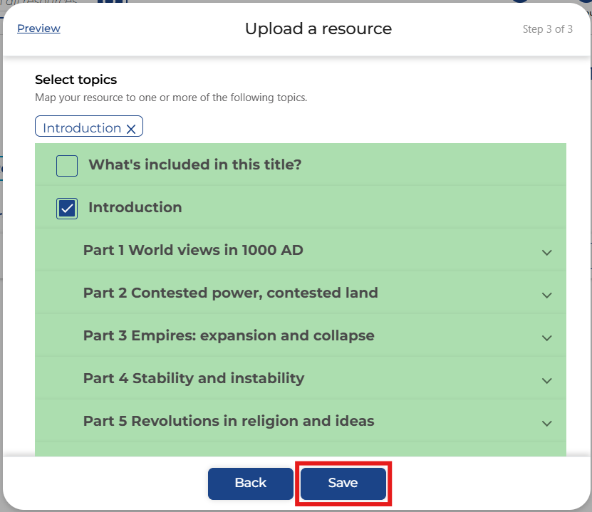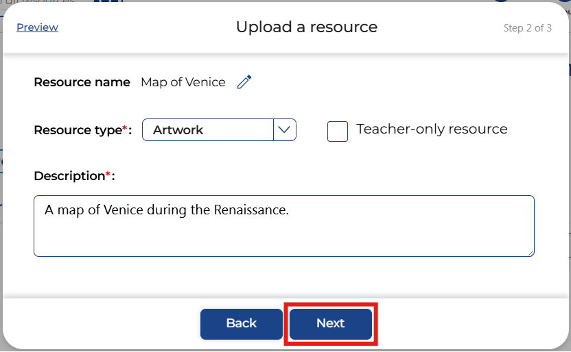 3. Edit the resource title, type and description of the uploaded resource. Choose 'Teacher-only resource' if you do not want students to have access to the resource. Click 'Next'.