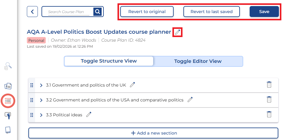 You can rename the Course plan by clicking the pencil icon at the top. Use the Save, Revert to lasted saved, and Revert to original buttons to save and reverse changes as needed.