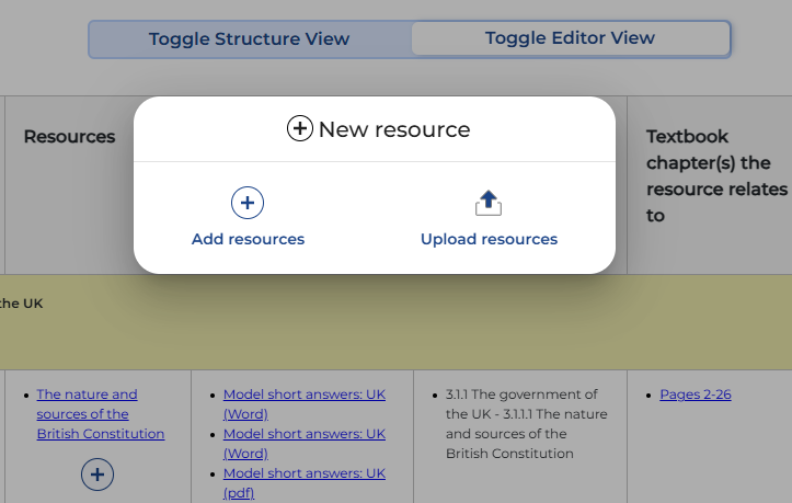 - Click the + icons to link resources in the 'Resources' and 'Exam focus resources' columns. You can add resources included with your Boost Course or upload your own resources to the Course for inclusion in the Course plan.