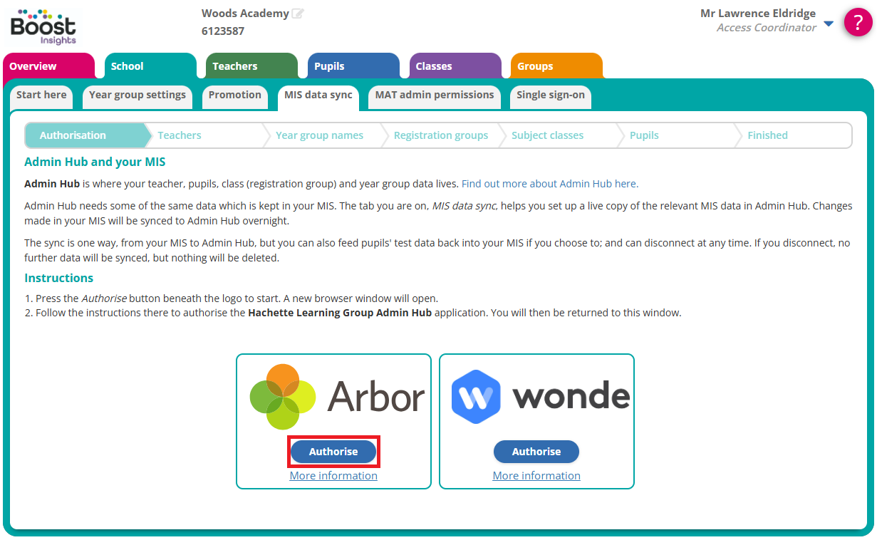 To sync with Arbor, you first need to authorise the connection in the Admin Hub:
