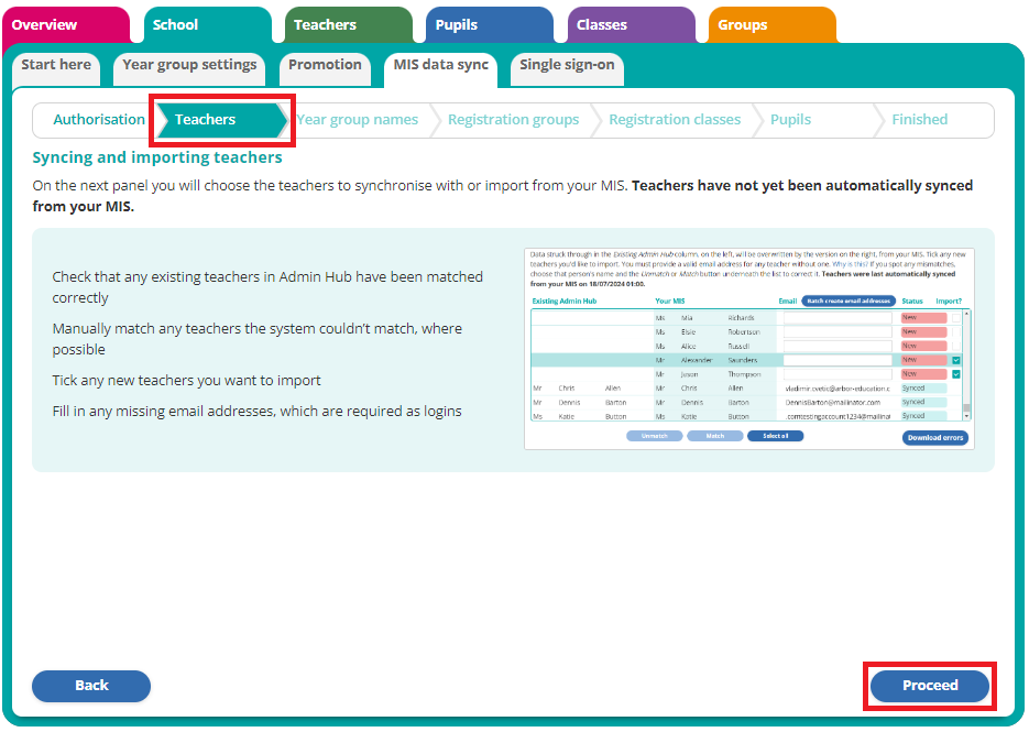 Once the connection with Arbor is authorised, click Start sync to move to the 'Teachers' panel, then Proceed in the bottom right to see the user list.
