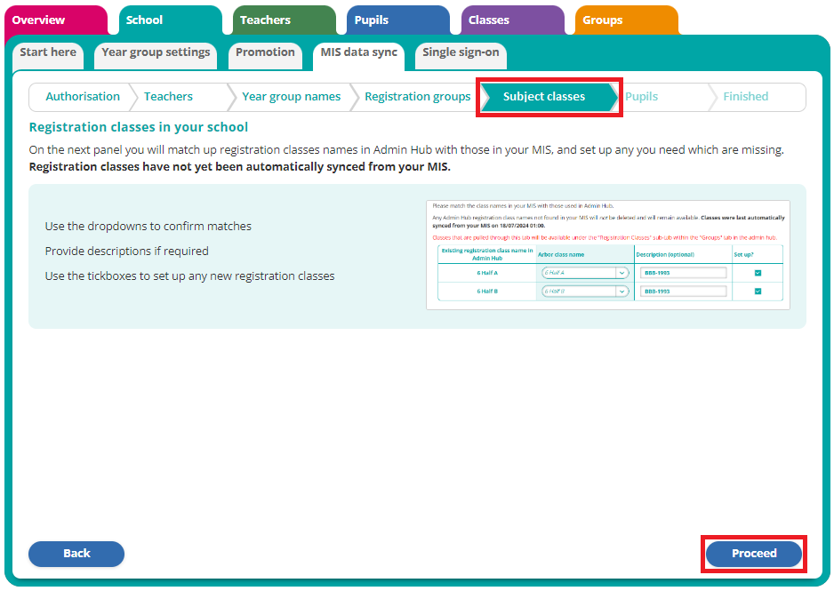 After syncing your registration groups, you'll be taken to the 'Subject classes' panel. Click Proceed to see the list of subject classes.
