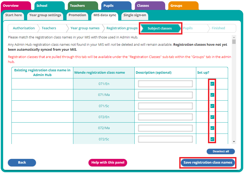 Tick the 'Set up?' column next to the classes you'd like to sync. If a class isn't matched to an existing record in the Admin Hub then it will be added to the orange Groups > Subject classes tab automatically.