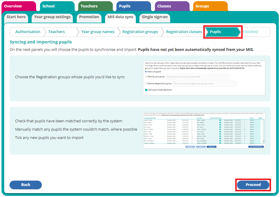 Once you've synced your registration groups and/or subject classes, you'll be taken to the 'Pupils' panel. Click Proceed, then review the following options: