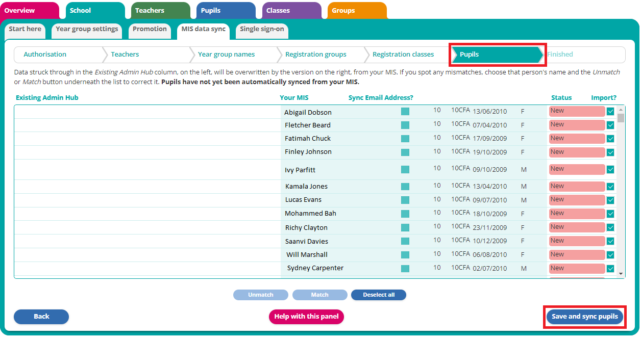 Once you're happy that the records are correctly matched, click Save and sync pupils in the bottom right.