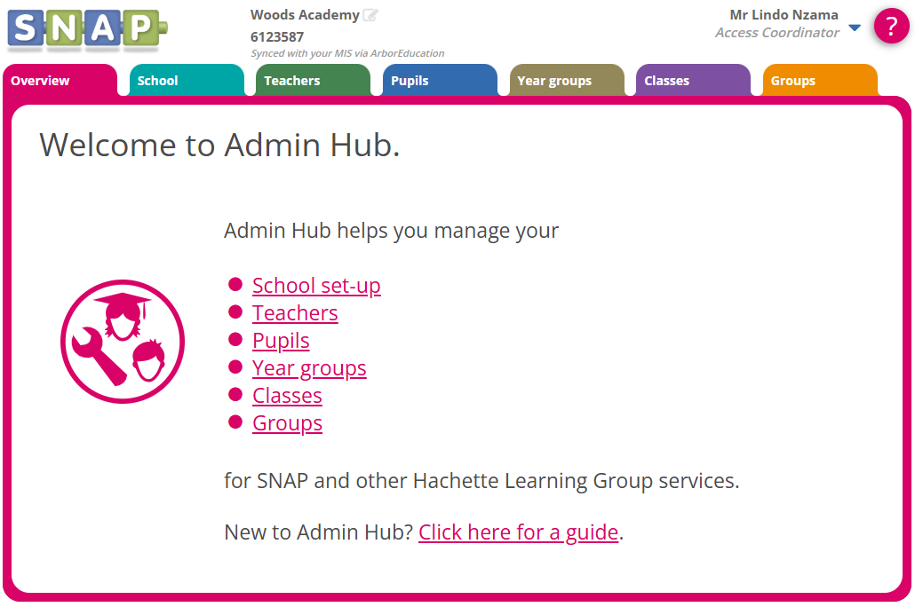 To access the SNAP Admin Hub, log in to SNAP and click the blue-green icon in the top right. The Admin Hub will open in a new tab.