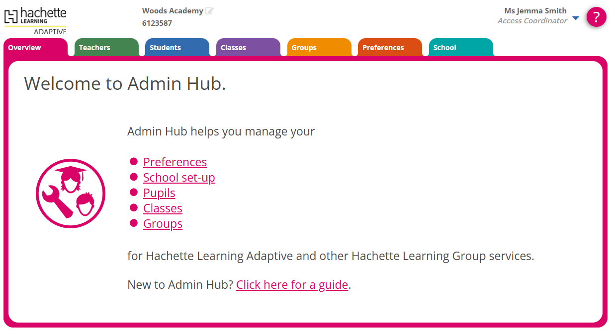 To access the Hachette Learning Adaptive Admin Hub, log in to Hachette Learning Adaptive and click Admin Hub in the bottom left. The Admin Hub will open in a new tab.