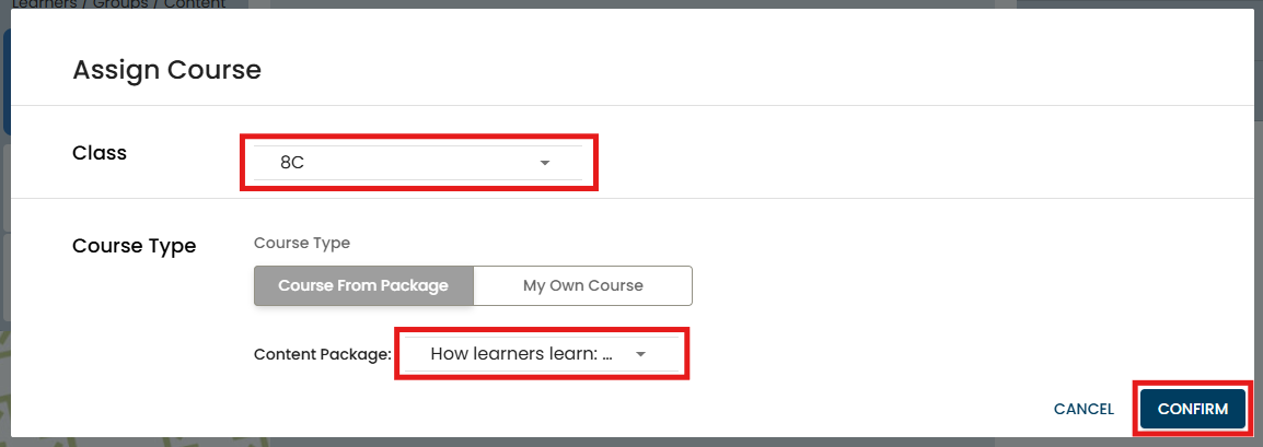 - Choose All learners in the class or click Selected learners to assign to the whole class or specific learners.