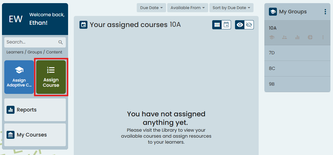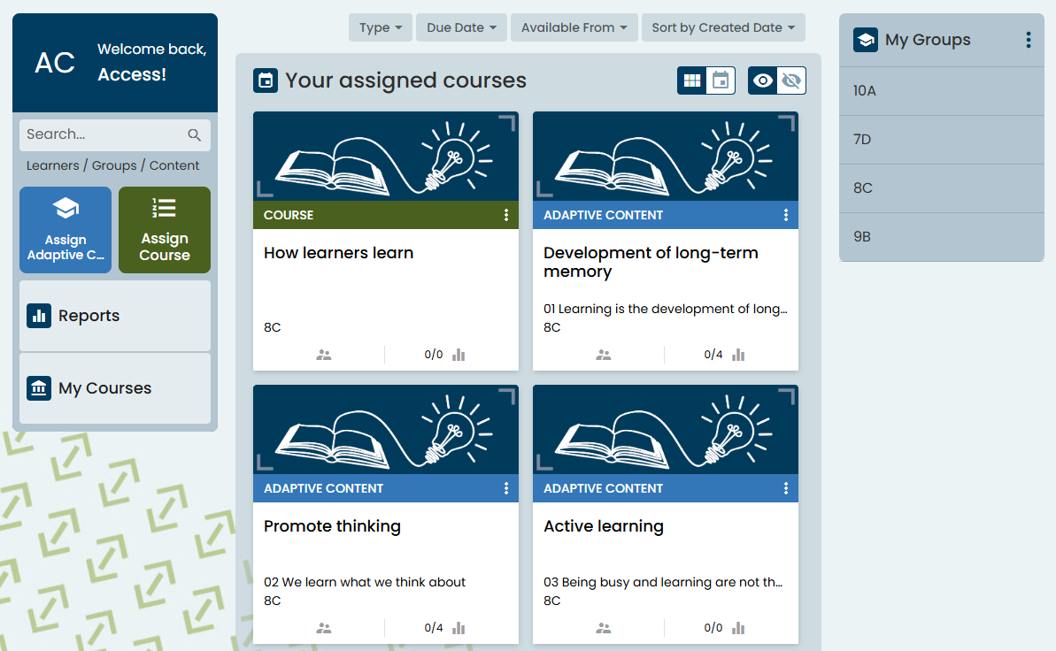 Once assigned, the course will appear as a card on the 'Your assigned courses panel' on the main dashboard. The adaptive content included in the course will be shown as separate cards.