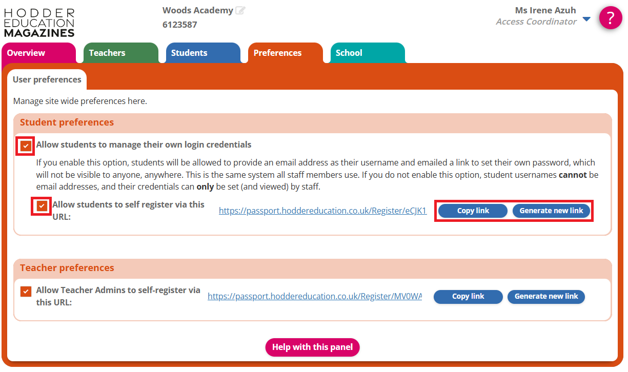 - Under 'Student Preferences', tick 'Allow students to manage their own login credentials' and 'Allow students to self-register via this URL'.