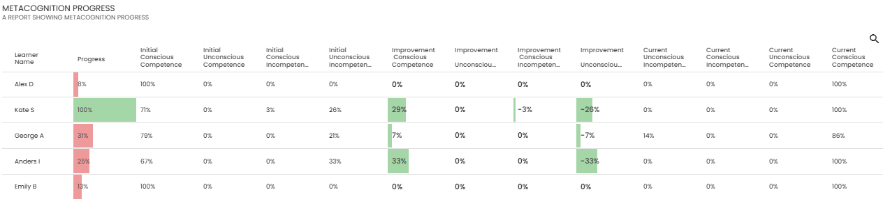 The Metacognition progress report shows how learners improved in both proficiency and metacognition during the learning activities.
