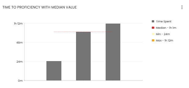 The 'Time to proficiency' tile shows how long it took each learner to reach their current level of proficiency, along with the median time for all learners in the class. Expect to see roughly a 4:1 ratio between the shortest and longest times (for learners at 100% proficiency).
