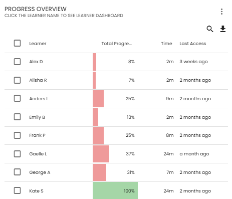 The Progress details report shows individual progress and time for each module and assignment. Click on the learning to access the Activity Log - a complete step-by-step transaction record of everything each learner did in the course.