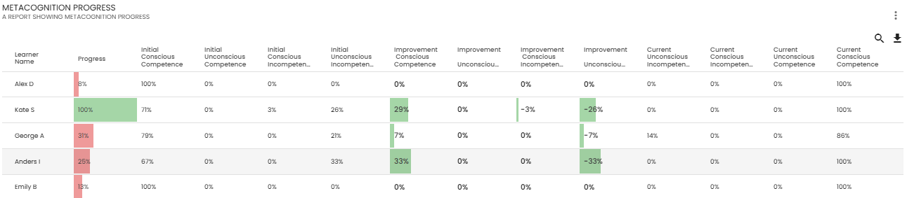 The Metacognition overview report shows learners' initial knowledge and how it has changed over the course.