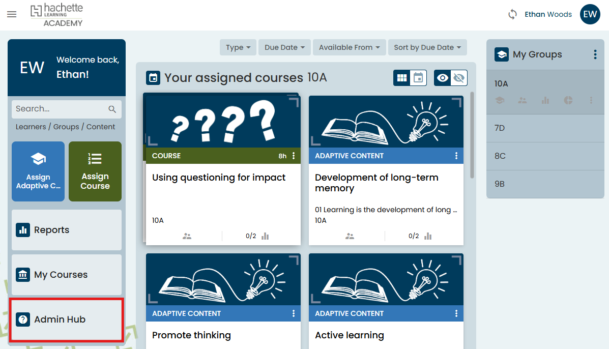 To access the Admin Hub in Hachette Learning Academy, log in and click Admin Hub in the bottom left. It will open in a new tab.