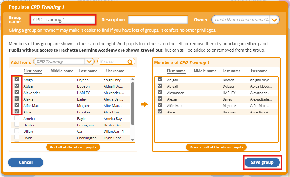 - Name the group and tick the users you'd like to add on the left.