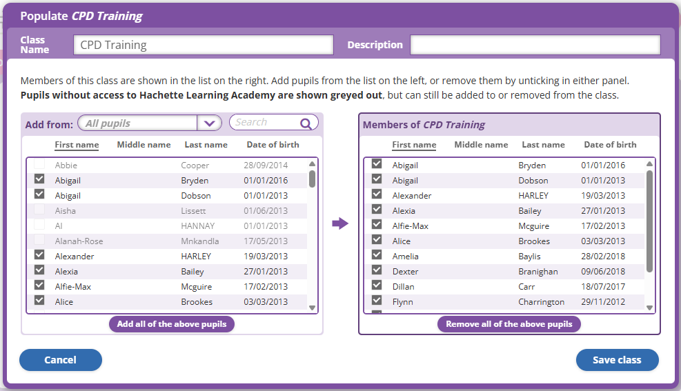 You can add and remove users from the class by ticking and unticking their names in the left and right-hand lists, respectively. Alternatively, you can edit them individually or in bulk via CSV to move them between classes.