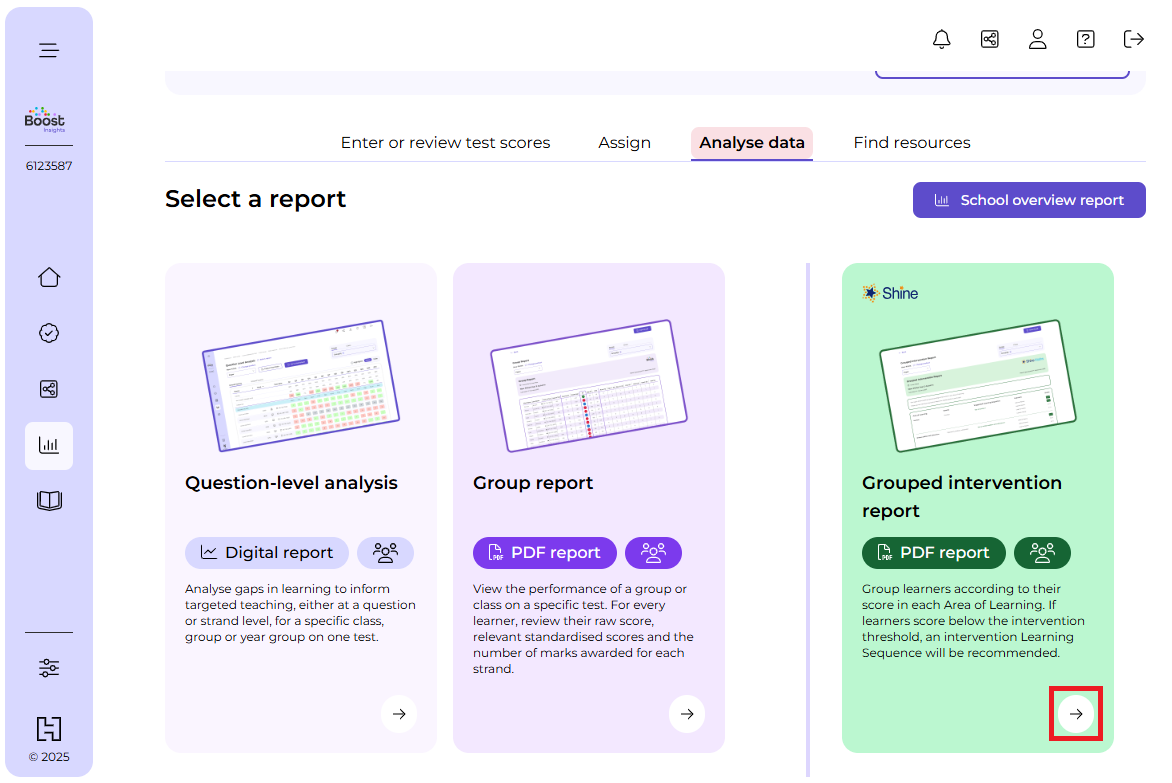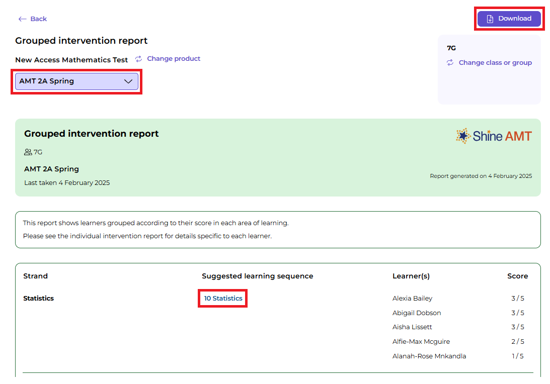 - Grouped intervention report: groups learners according to their score in each Area of Learning. If learners score below the intervention threshold then an intervention Learning Sequence will be recommended.