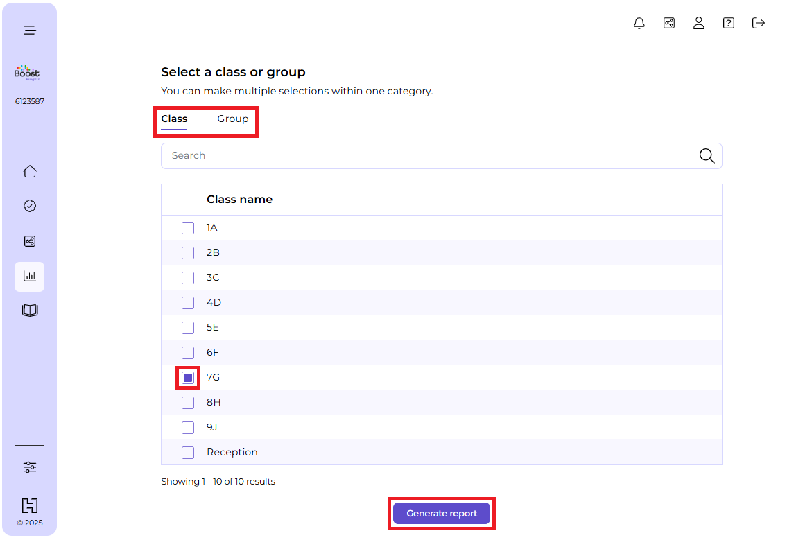 - Individual intervention report: shows the performance of an individual learner. If learners score below the intervention threshold in any Area of Learning an intervention Learning Sequence will be recommended.