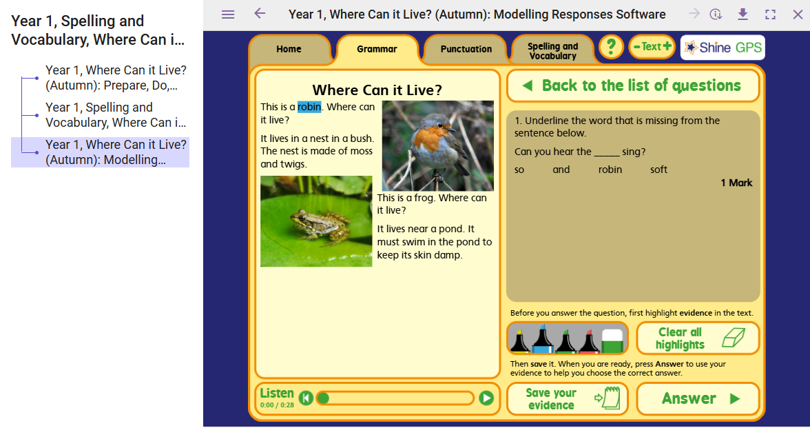 Shine Reading and GPS include interactive modelling software for the 'Text A' Learning Sequences. You can use the modelling software with a large group on an interactive whiteboard or with smaller groups and individual learners on desktops and handheld devices.